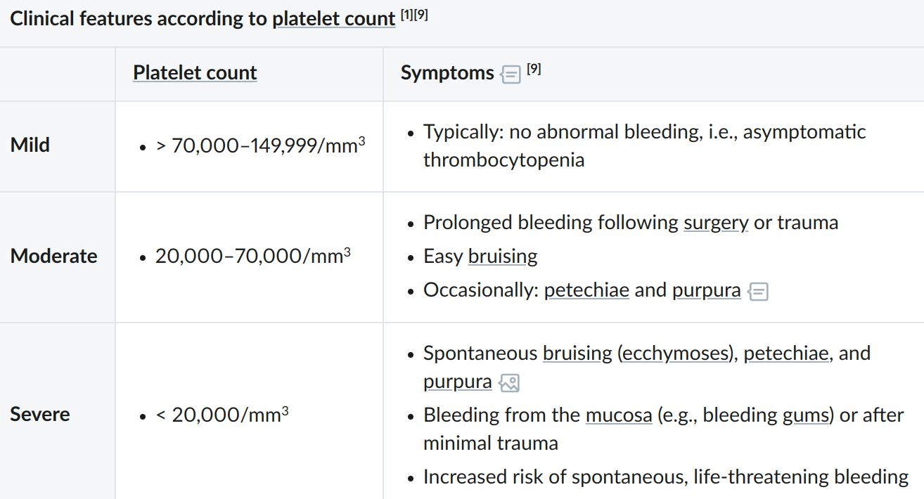 - Clinical features can correlate with platelet count; but most patients are asymptomatic: